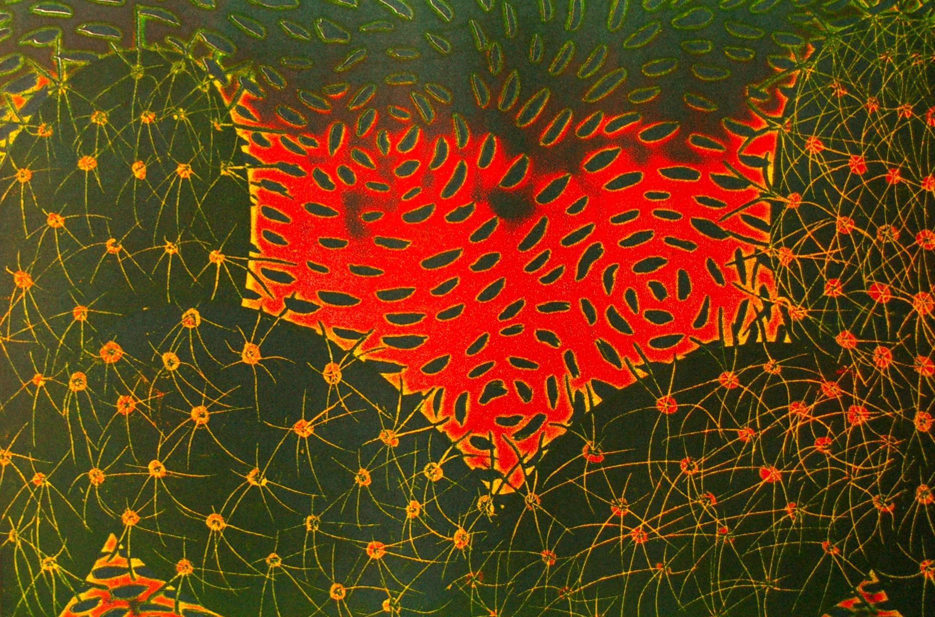 This is from a series of zinc plate etchings called Survivors in a Social Desert. The artist statement may be found on the catalogue page. The size is roughly 19 3/4 by 25 3/4 inches. They are printed on BFK Rives paper. This image was printed in an edition of 20.