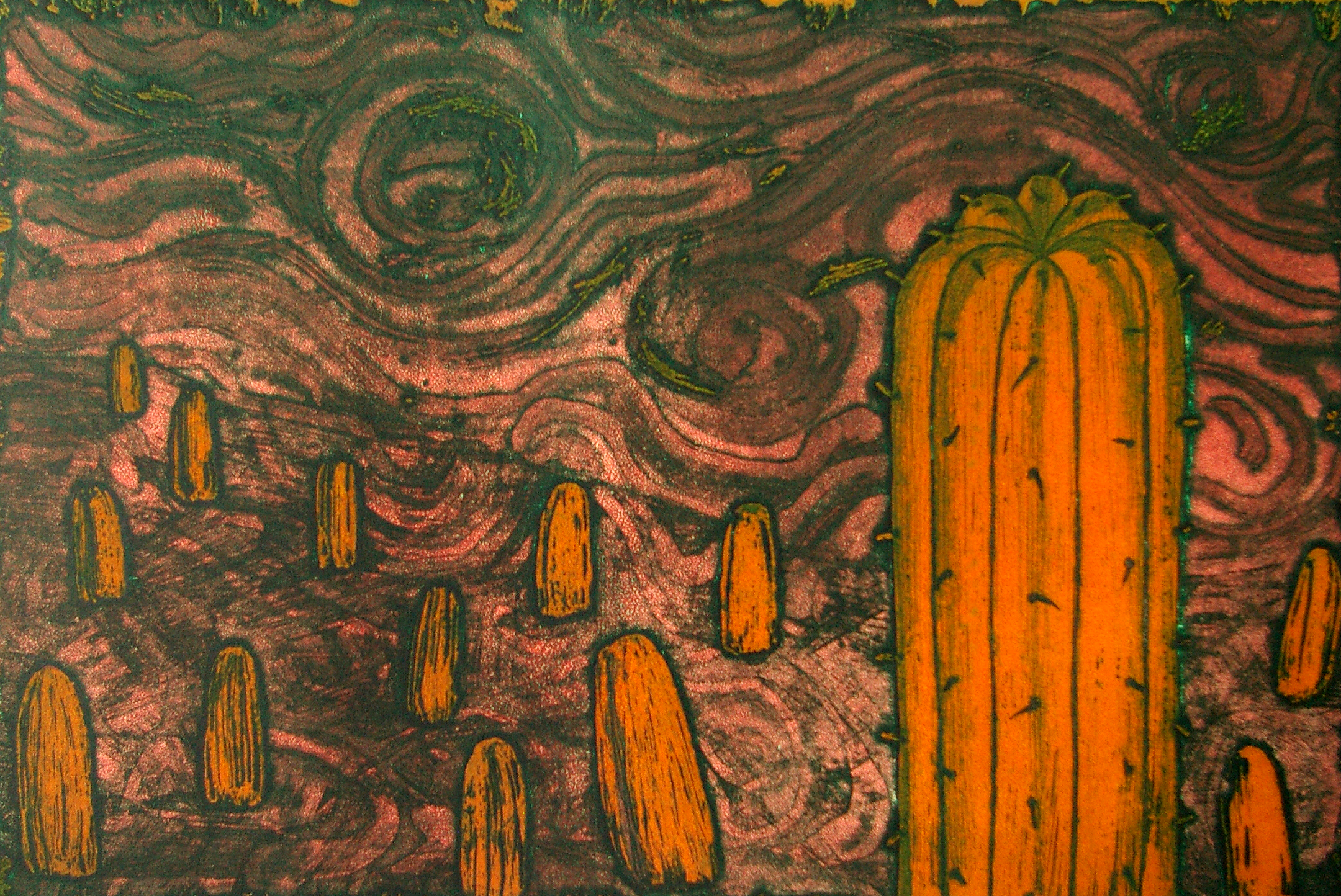 This is from a series of zinc plate etchings called Survivors in a Social Desert. The artist statement may be found on the catalogue page. The size is roughly 19 3/4 by 25 3/4 inches. They are printed on BFK Rives paper. This image was printed in an edition of 6.
