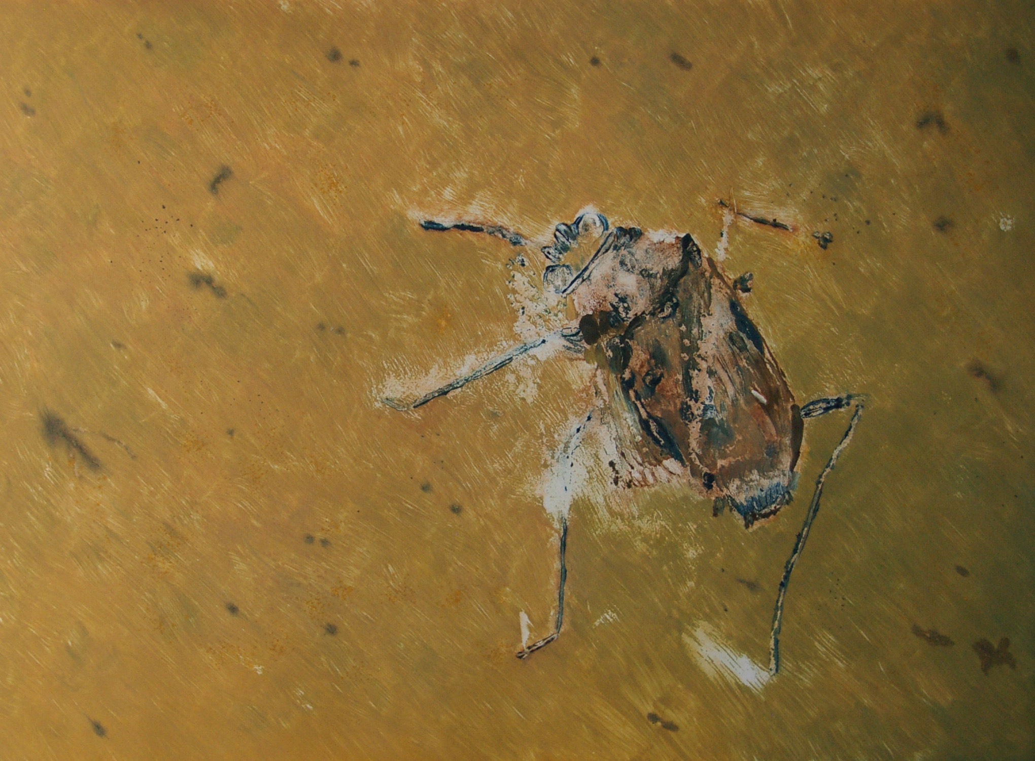 This is from a series of monoprints called Rock Paper Rock, which were created by mixing water soluble oil paint, painting it on plexiglass and printing the image on rag paper. The size is roughly 19 3/4 by 25 3/4 inches.
