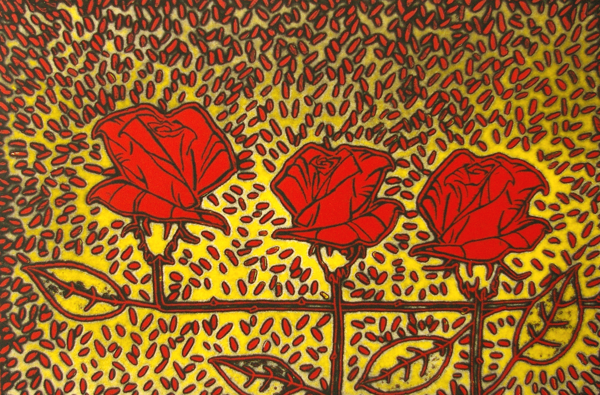 This is from a series of zinc plate etchings called Survivors in a Social Desert. The artist statement may be found on the catalogue page. The size is roughly 19 3/4 by 25 3/4 inches. They are printed on BFK Rives paper. This image was printed in an edition of 20.