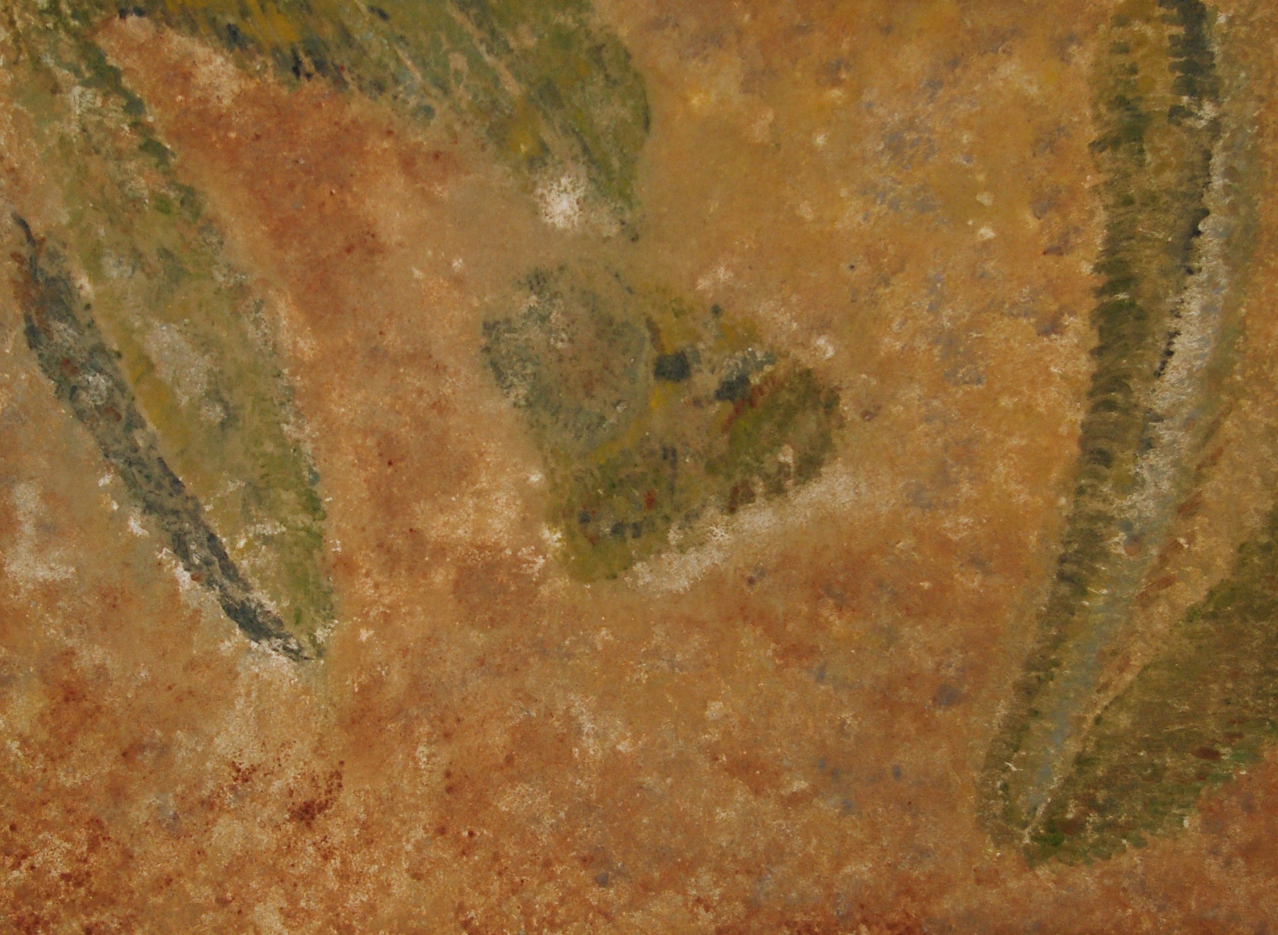 This is from a series of monoprints called Rock Paper Rock, which were created by mixing water soluble oil paint, painting it on plexiglass and printing the image on rag paper. The size is roughly 19 3/4 by 25 3/4 inches.
