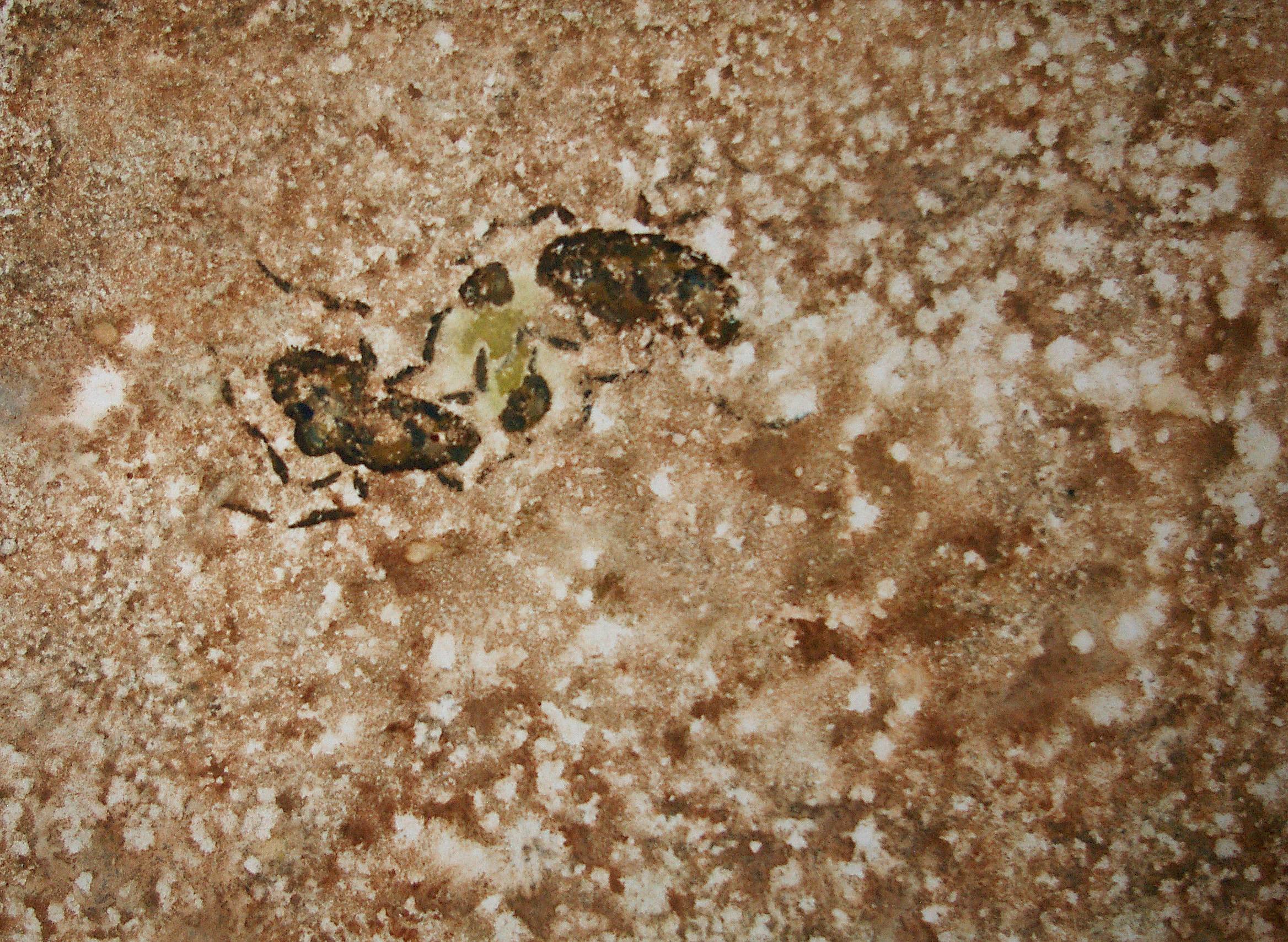 This is from a series of monoprints called Rock Paper Rock, which were created by mixing water soluble oil paint, painting it on plexiglass and printing the image on rag paper. The size is roughly 19 3/4 by 25 3/4 inches.