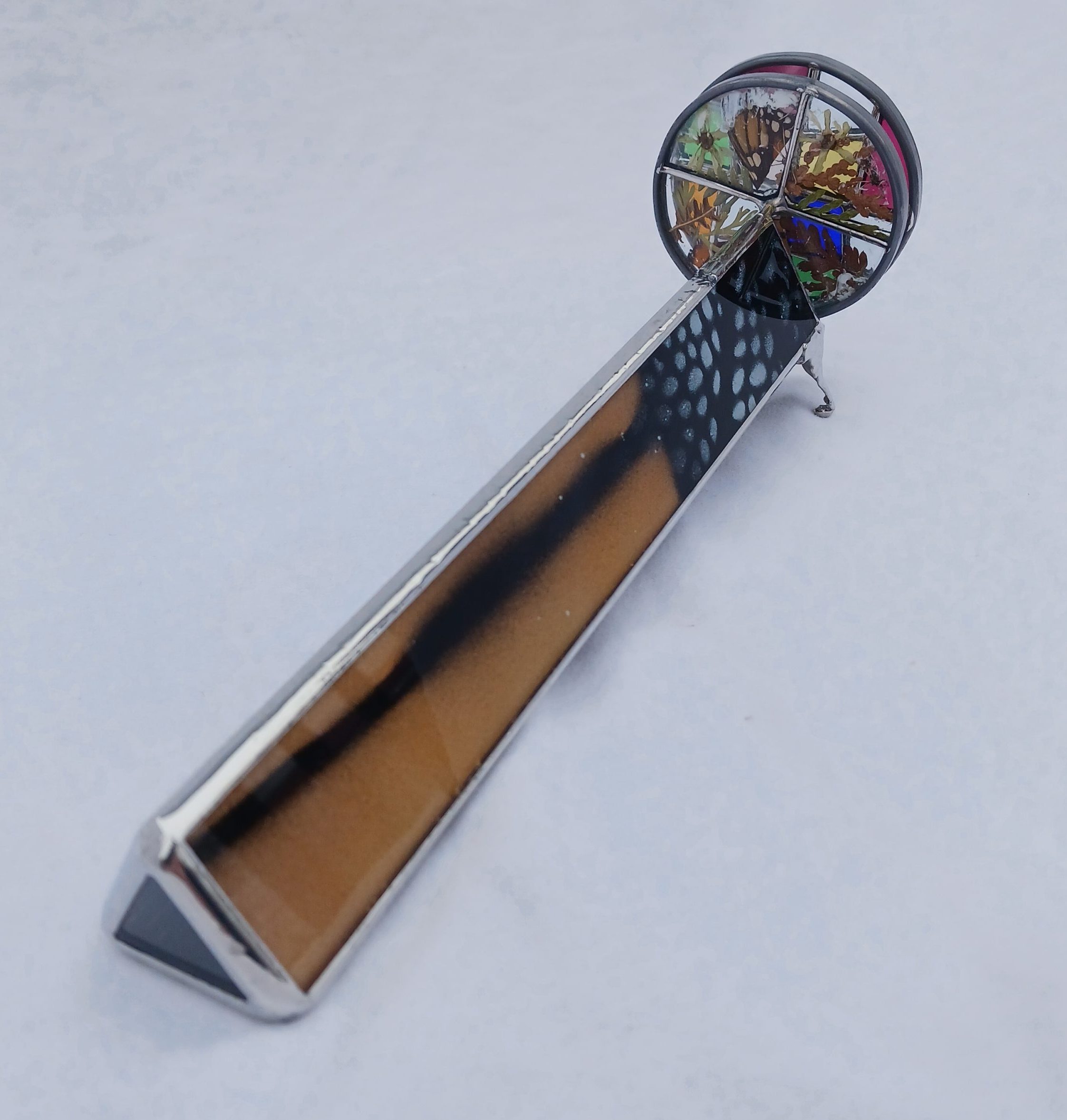 “The Naturescope is made with the back wheel closest to the optic field content consisting of two discs of wafer thin glass, between which is sandwiched all manner of things from nature. For example I use insect parts, particularly butterfly wings, blossoms from flowers, leaves from trees… I was thinking of using feathers but haven’t done any of those yet.” John Cooper.