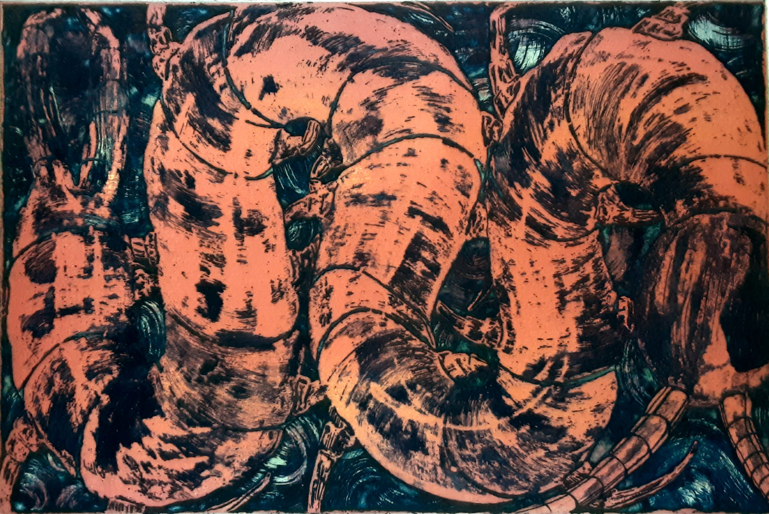 This copper plate etching print was done on rag paper measuring 19.5×25.5 inches. The print itself measures 11.75×17.5 inches. It is from the series called Higher Ground. This print edition number was 10.