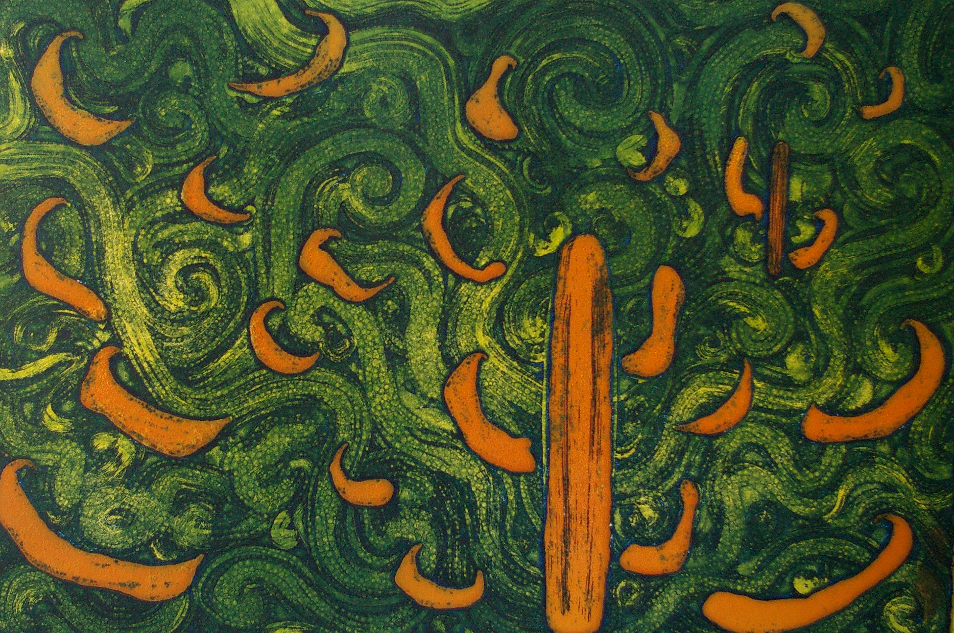 This is from a series of zinc plate etchings called Survivors in a Social Desert. The artist statement may be found on the catalogue page. The size is roughly 19 3/4 by 25 3/4 inches. They are printed on BFK Rives paper. This image was printed in an edition of 9.