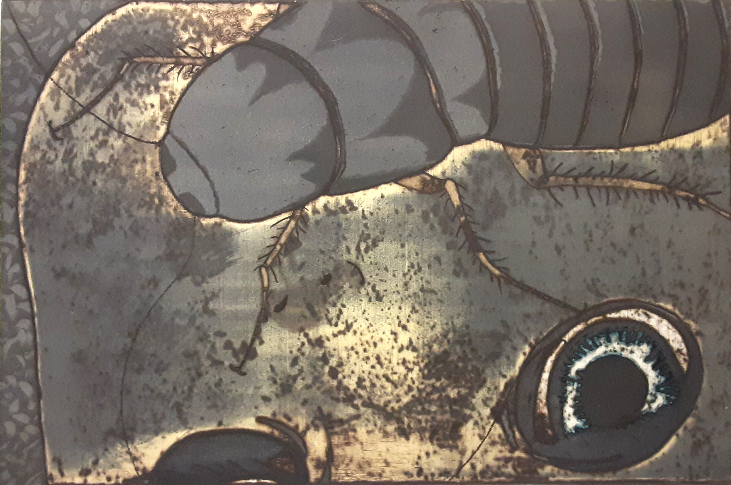 This copper plate etching print was done on rag paper measuring 19.5×25.5 inches. The print itself measures 11.75×17.5 inches. It is from the series called Higher Ground. This print was never editioned. This is a working proof #2.